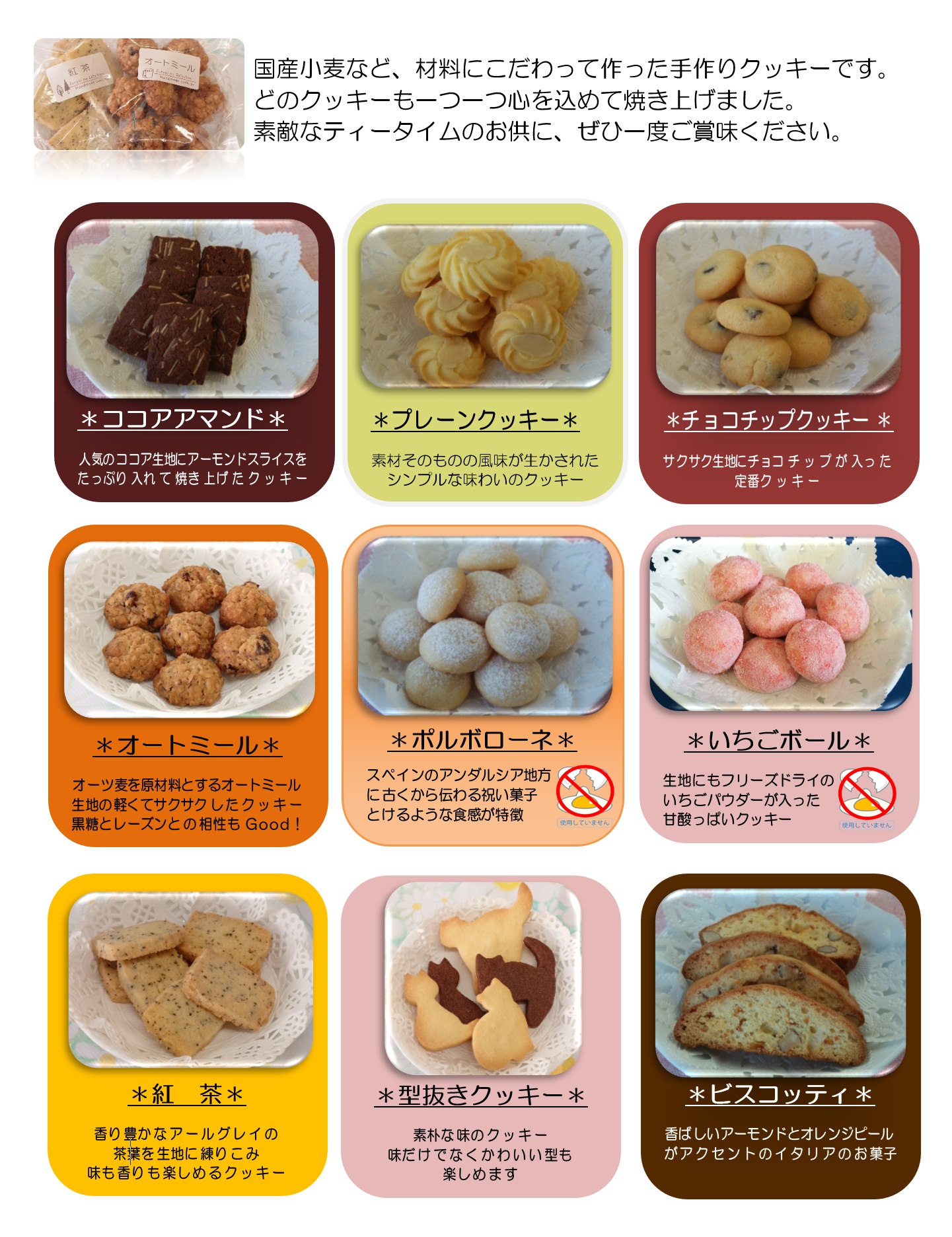 添加物を最小限にして国産小麦など材料にこだわった手作りクッキーです。小さなお子さまも安心して食べていただけます。卵を使用していないクッキーもあります。